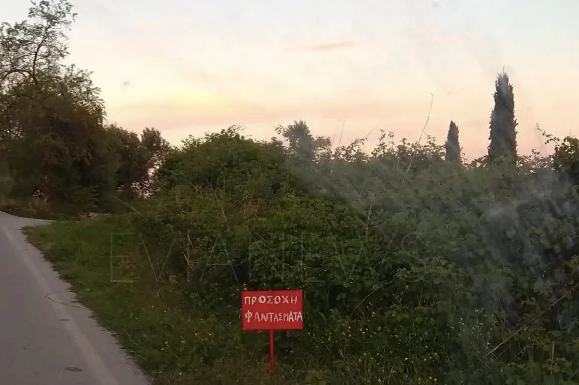 Με κόκκινο φόντο και έντονα λευκά γράμματα, η ταμπέλα έγραφε απλά αλλά καθηλωτικά: «ΠΡΟΣΟΧΗ ΦΑΝΤΑΣΜΑΤΑ».