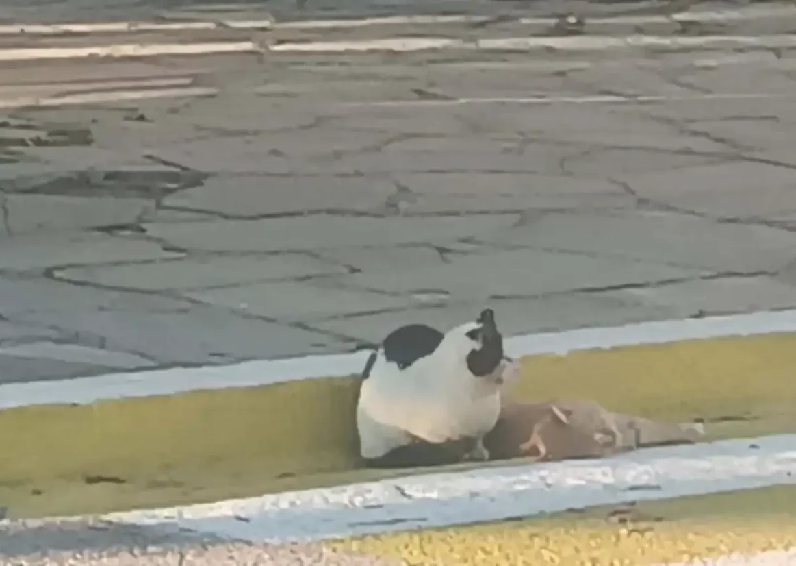 Εκεί φαίνεται μια γατούλα να θρηνεί πάνω από το πτώμα της νεκρής φίλης της, την οποία σκότωσε αυτοκίνητο.
