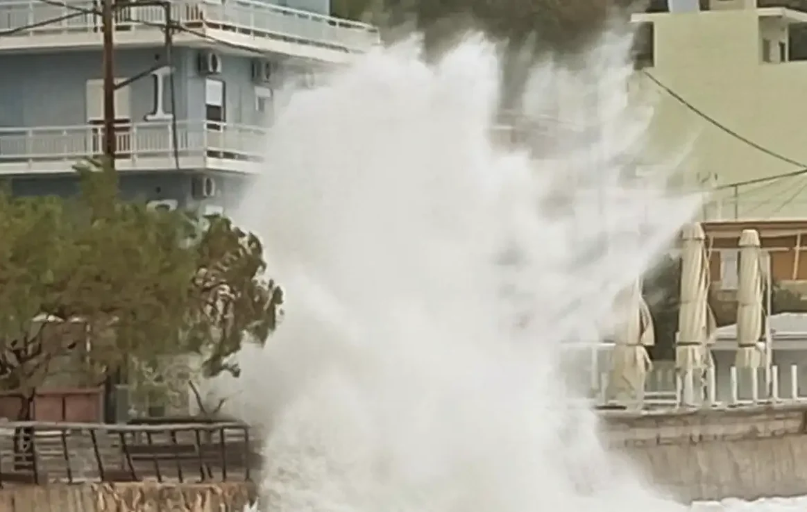 Στην εικόνα φαίνεται η τεράστια μάζα νερού να υψώνεται σαν «τοίχος» μπροστά από την παραλιακή ζώνη, σκεπάζοντας κυριολεκτικά το τοπίο με αφρό και υδρατμούς.