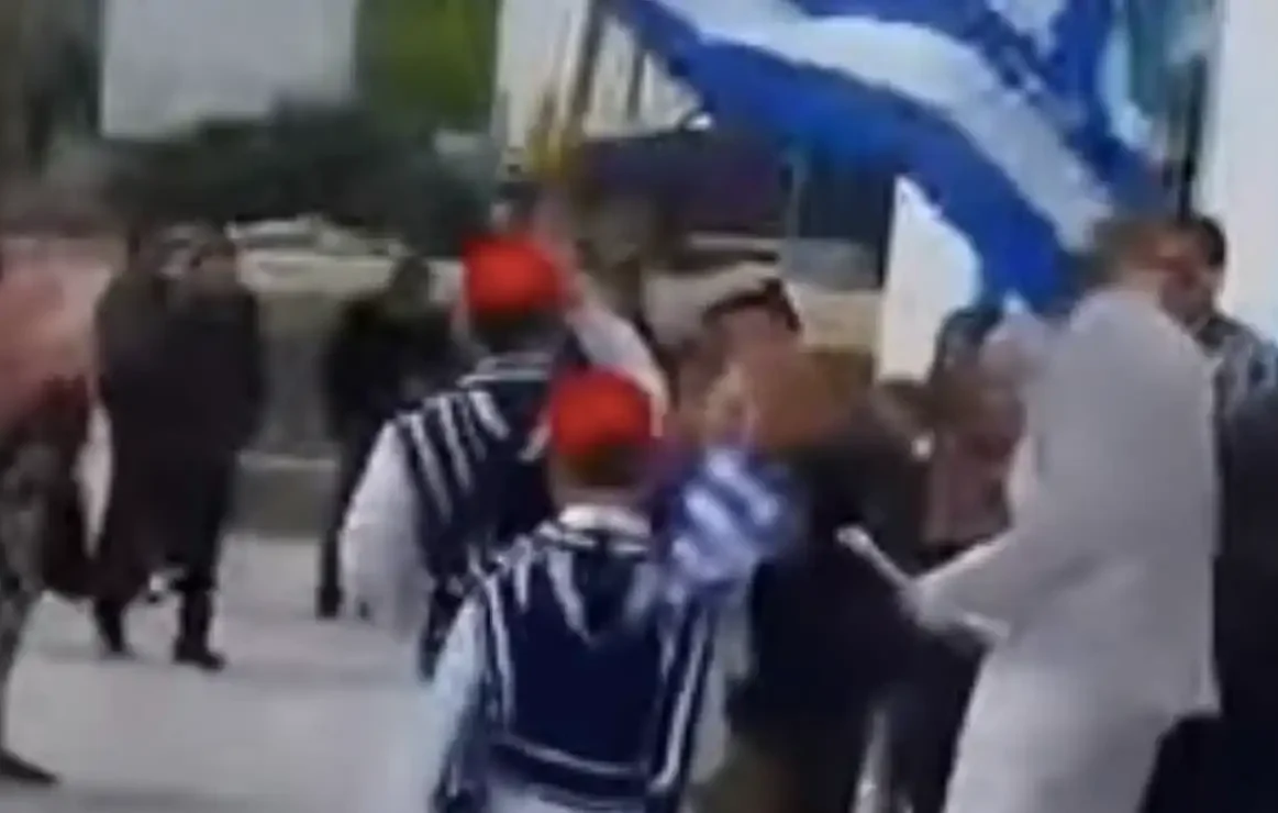 Τα δύο παιδιά, ντυμένα με παραδοσιακές στολές τσολιά, στάθηκαν περήφανα δίπλα στον δάσκαλό τους, κρατώντας ψηλά την ελληνική σημαία.
