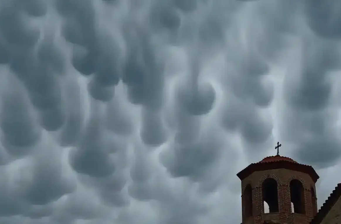 Η φωτογραφία δείχνει ένα εντυπωσιακό ουρανό με mammatus σύννεφα, τα οποία έχουν ένα χαρακτηριστικό σφαιροειδές σχήμα που κρέμεται προς τα κάτω.